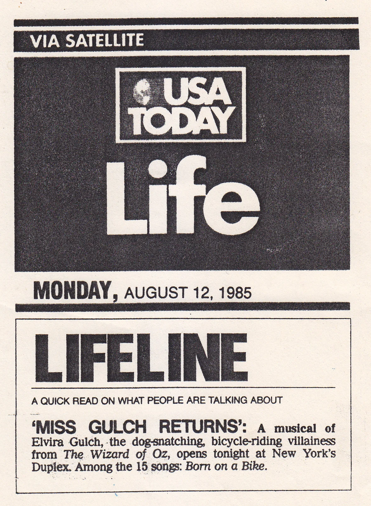Miss Gulch is back in all the glory Hollywood denied her. She sings (at last!). She plays a mean piano (and what other kind?) She gives us the dirt. She dumps Hollywood and gives the real world a try – and lands a job as well as the next man (and lands the next man, as well). She lays her soul bare, and yours if you dare. So turn on the phone machine, turn Judy's picture to the wall, turn up the volume, and welcome to the wit and wisdom of Miss Gulch – “Entertainess Extraordinaire!”